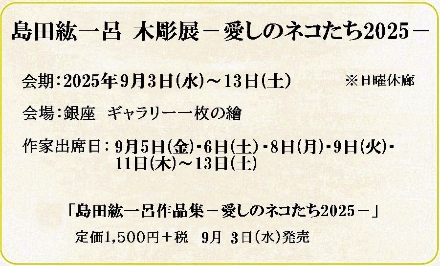 がいつも私の創作意欲を掻き立ててくれます。モデルのネコ君たちの長生きを祈りながら、その自然な姿を形に留めたいと願っています。そんな彼らの木彫作品とレリーフを合わせて約40点出品します。皆様のご来場をお待ちしています。